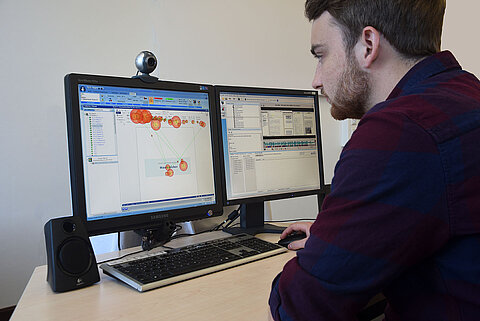 Die Anmeldung an den Computern erfolgt über eine zentrale Nutzerverwaltung, sodass Angehörige der Fakultät in allen Multimedia-Laboren mit den gleichen Anmeldeinformationen arbeiten können.