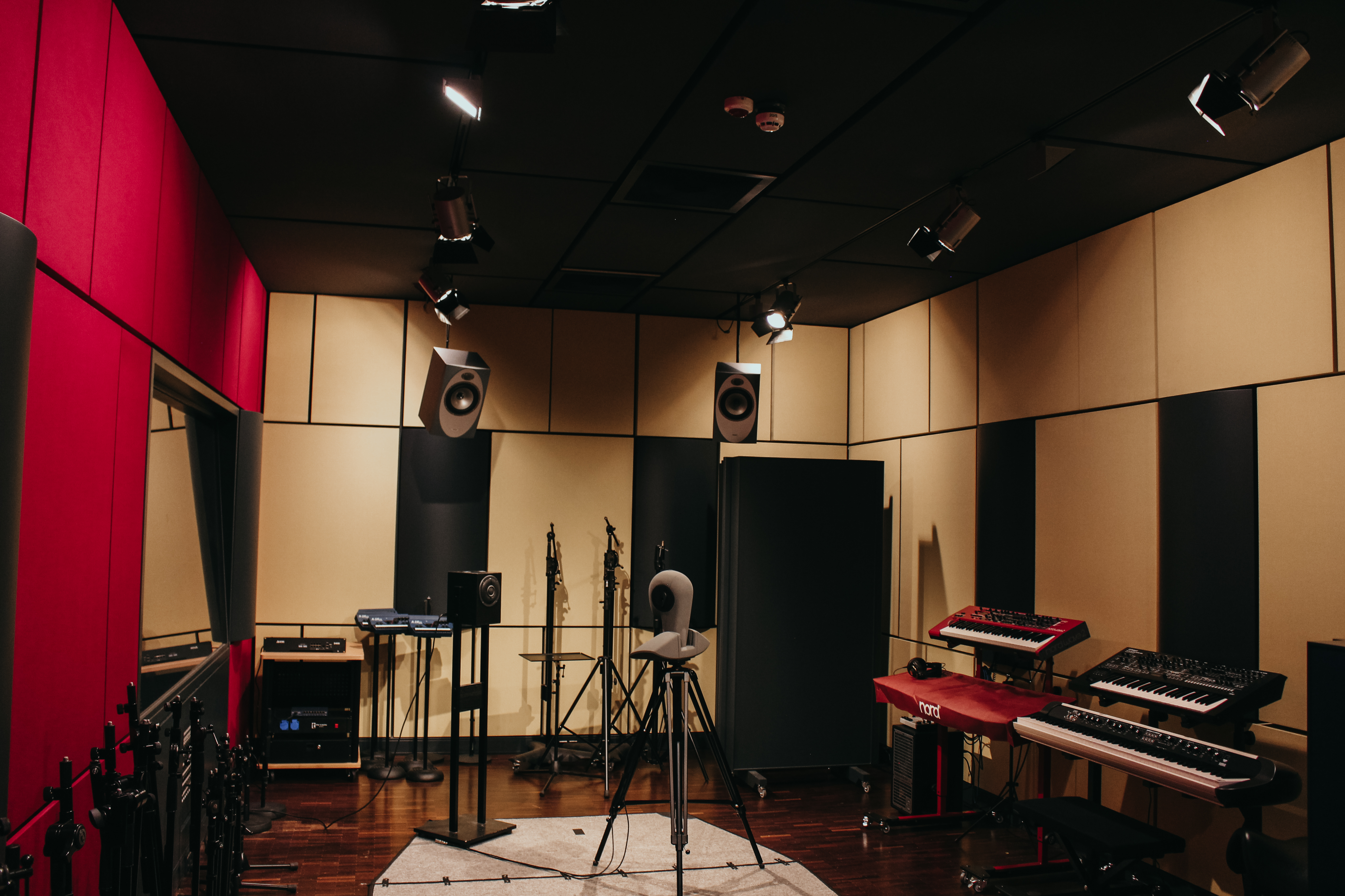 In unserem Tonstudio haben Studierende die Möglichkeit hochwertige Audioproduktionen aufzunehmen. Einige Instrumente stehen auch für Musikproduktionen zur Verfügung. Der Regieraum ist auf dem neuesten technischen Stand und auch für die Abhöre akustisch optimiert.