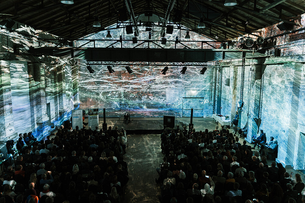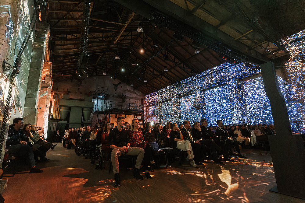 Während der Graduierung und beim anschließenden Sektempfang konnten die Gäste eindrucksvolle Lichtprojektionen bewundern, die Teil der im Kunstkraftwerk zu besichtigenden Ausstellungen HUNDERTWASSER experience und Die Wunderwelten von Alice waren.