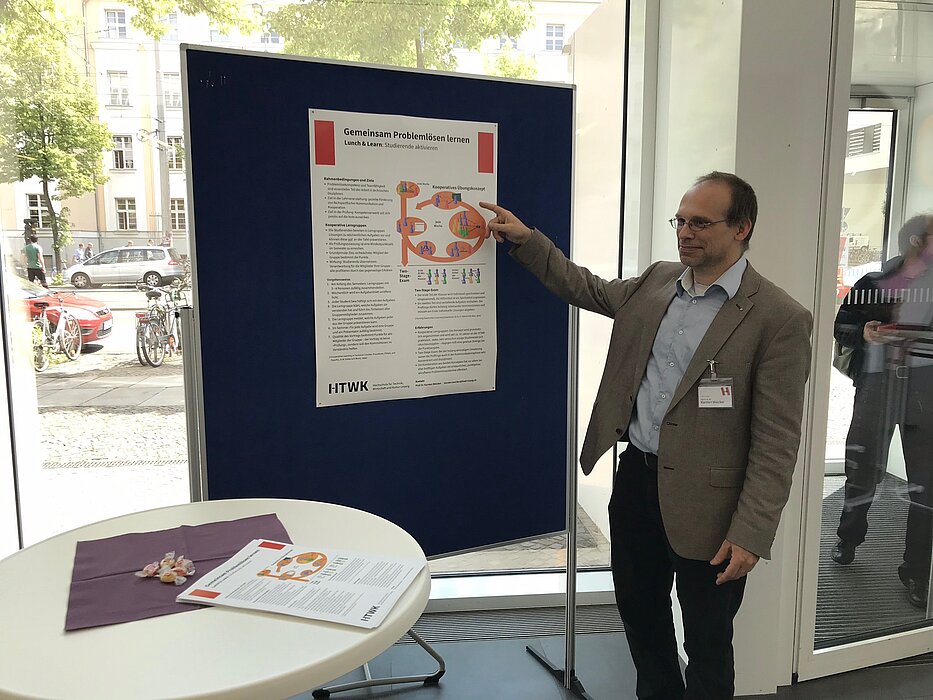 Ein paar Meter weiter gab es Infos zum „Gemeinsam Problemlösen lernen” bei Professor Karsten Weicker, Studiendekan Informatik. Hier bekam man nicht nur eine direkte Schritt-für-Schritt-Anleitung, wie man die klassischen kooperativen Lerngruppen fördert, sondern auch einen interessanten Aspekt zum „Two-Stage-Exam“. Diese Methode bringt in Kombination mit dem ersten Konzept erstaunliche Ergebnisse und ein punktgenau abrufbares Problemlösepotential hervor. Zusammen mit Professor Weicker unterstützt Informatik-Student Karl-Augustin Jahnel das Projekt, welcher zu diesem Vorgehen meinte, dass man auch die studentische Sicht den Lehrenden näher bringen müsse.