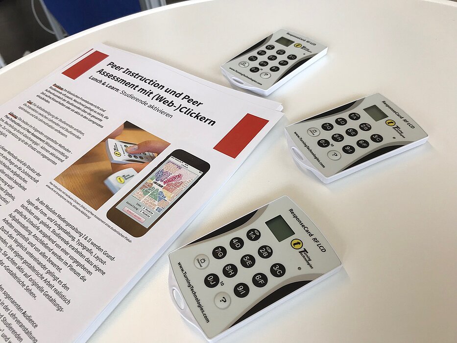 Ein praktisches Beispiel: „Peer Instruction und Peer Assessment mit (Web-) Clickern“. Diese Clicker, die im Grunde aussehen wie kleine Fernbedienungen oder Taschenrechner, bringen einen großen Vorteil mit sich: Sie lassen die Studierenden aktiv werden und helfen dabei, Bewertungs- und Beurteilungskompetenz zu schaffen, beispielsweise beim Vergleich und der Bewertung von gestalterischen Entwürfen anderer Studenten in der Gruppe. So können klassische Umfrage-Zettel und Stifte abgelöst und Daten direkt digitalisiert ausgewertet werden. „Es sollte nicht zu anspruchsvoll sein, aber auch nicht zu einfach“, meint André Göhlich, der in den Lehrbereichen Kommunikationsdesign und Elektronisches Publizieren an der HTWK tätig ist. Professor Ulrich Nikolaus erklärte den didaktischen Einsatz der Clicker.