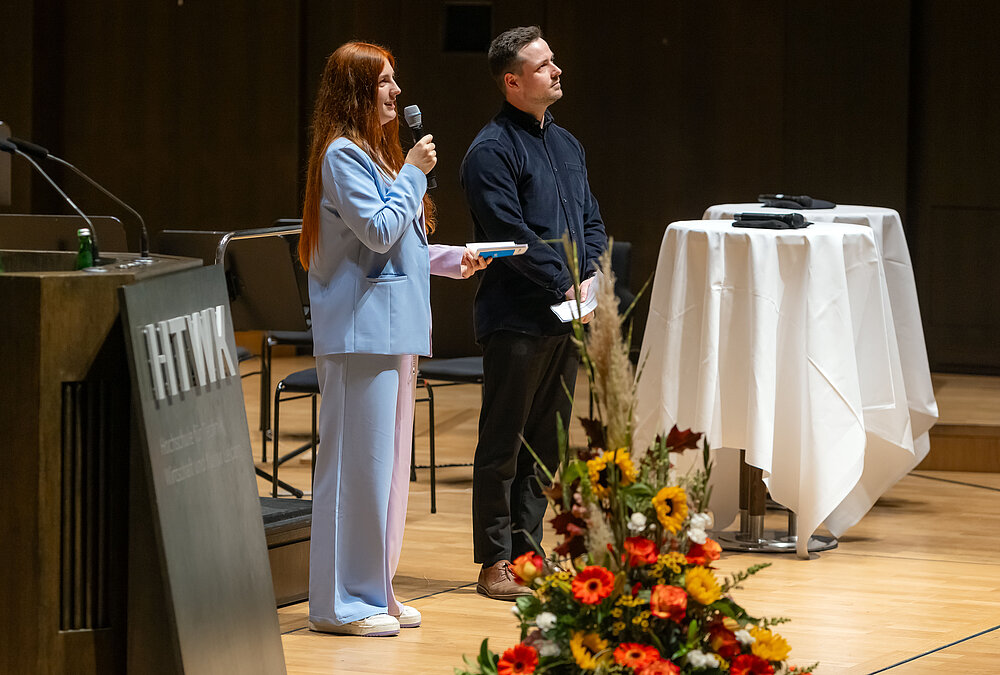 Durchs Programm der Immafeier führten Studentin Pauline Schröers und Absolvent Dr. Franz Anders. Sie moderierten auch die Podiumsdiskussion mit Leipzigs Oberbürgermeister Burkhard Jung, dem HTWK-Hochschulratsvorsitzenden Dr. Mathias Reuschel und der Prorektorin für Bildung Prof.in Barbara Mikus – die Themen reichten von ganz persönlichen Studientipps, Jobbeschreibungen und dem bekräftigten Aufruf für studentisches Engagement.