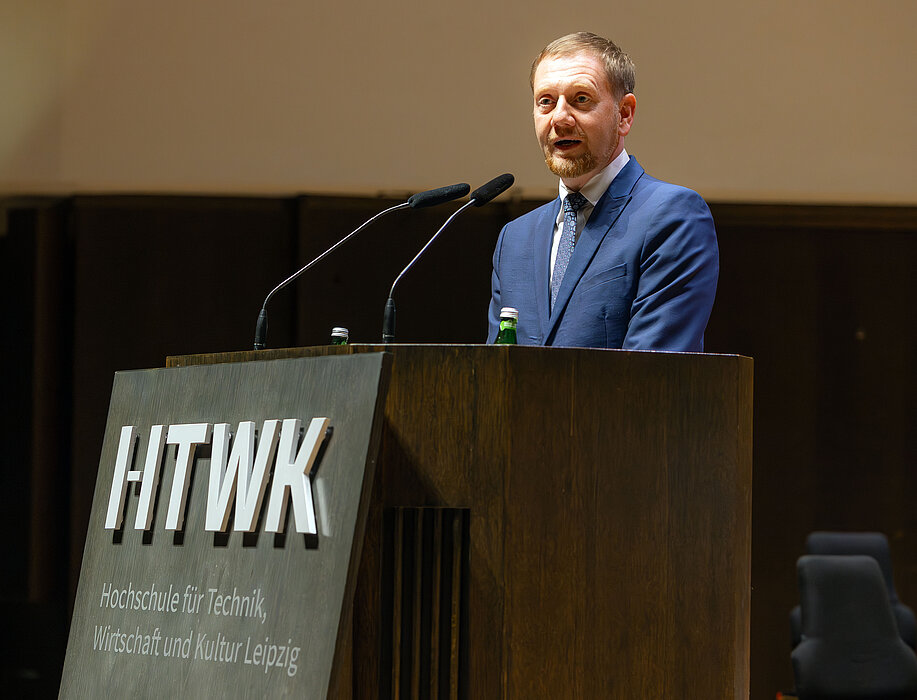 Sachsens Ministerpräsident Michael Kretschmer bekannte in seinem Grußwort, ein „Verfechter der Hochschulen Angewandter Wissenschaften“ (HAW) zu sein, nicht nur, weil er selbst Absolvent einer solchen sei. Herausforderungen könne nicht nur mit Beschränkungen begegnen, sondern vor allem auch mit Innovationen. „Alles ist noch möglich in der Wissenschaft“, so Kretschmer – und das Studium die schönste Zeit im Leben.