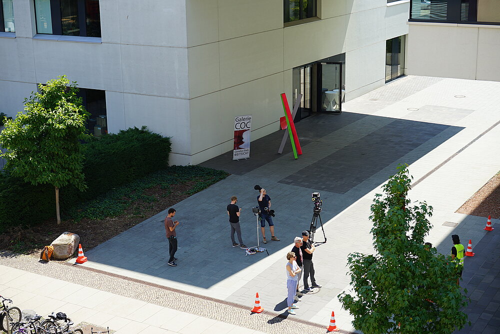 „Ist das Ihre?“ fragt Udo Schenk und zeigt auf die neonfarbene Holzskulptur vor dem Gebäude. Nein, ist sie nicht, obwohl so eine Galerie und ein Medienzentrum ja inhaltlich auch nicht sooo weit weg voneinander sind und man das durchaus denken könnte. Kunst am Bau - aber leider direkt wieder mitgenommen von den Filmausstattern.