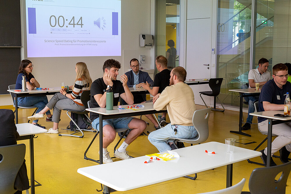 Einen Austausch und die Vernetzung mit anderen Forschenden ermöglichte das Science Speed Dating organisiert von der Promovierendenvertretung ProV. Promotionsinteressierte konnten dabei mit Promovierenden an der HTWK Leipzig ins Gespräch kommen und Tipps für den Einstieg in die Promotion erhalten. Unter der Devise „Ask me anything“ konnten Interessierte fünf Minuten lang Promovierende mit Fragen löchern.