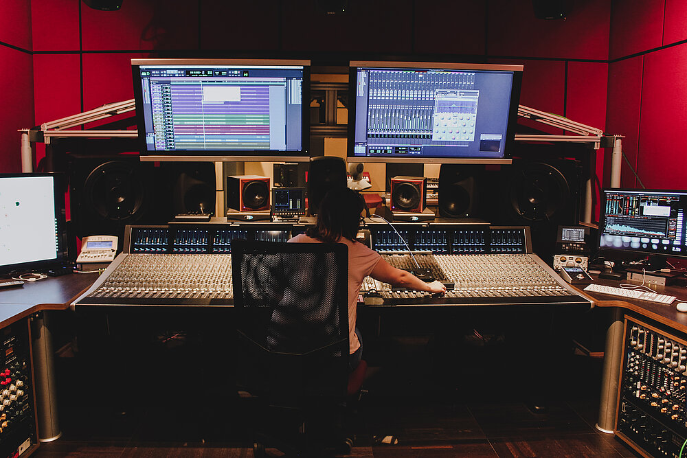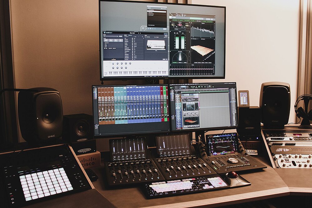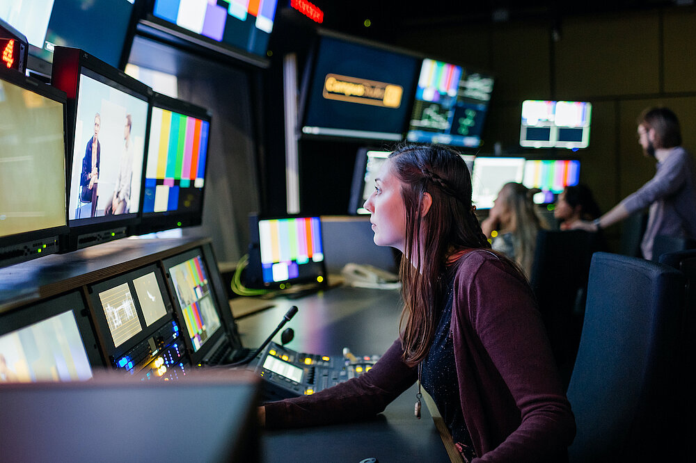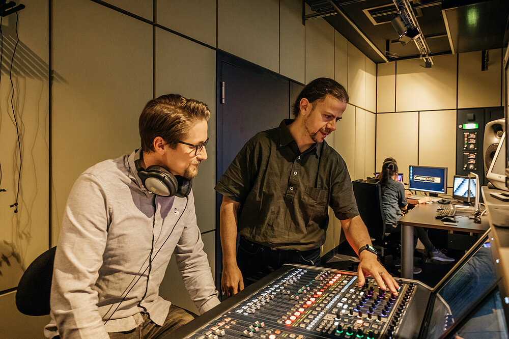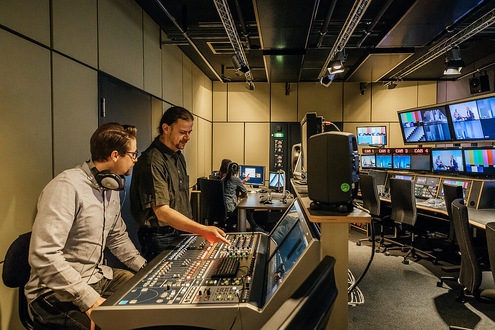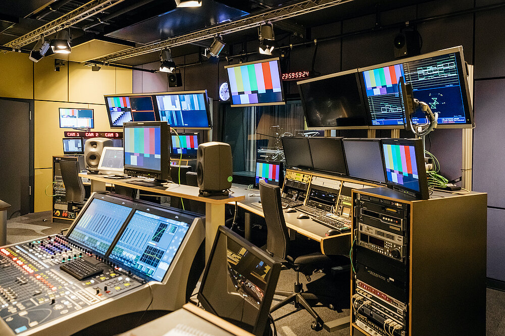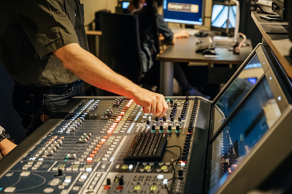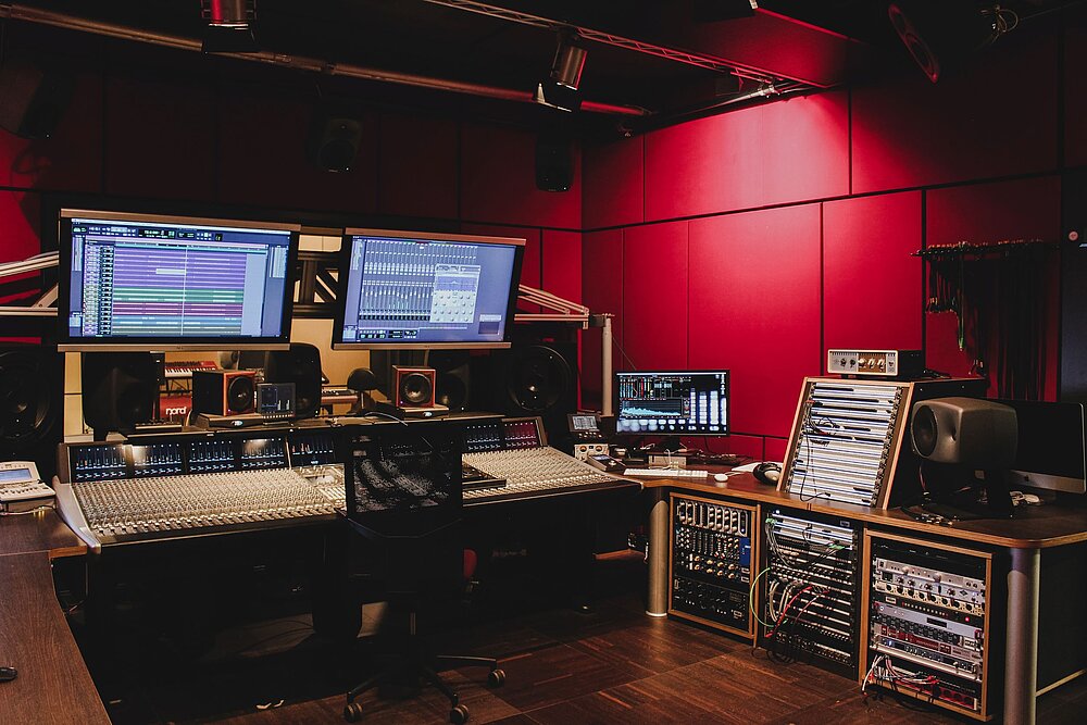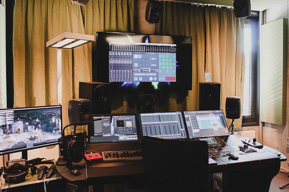 In unserem Tonstudio haben Studierende die Möglichkeit hochwertige Audioproduktionen aufzunehmen. Einige Instrumente stehen auch für Musikproduktionen zur Verfügung. Der Regieraum ist auf dem neuesten technischen Stand und auch für die Abhöre akustisch optimiert.