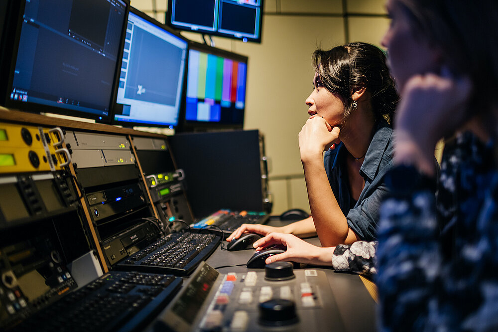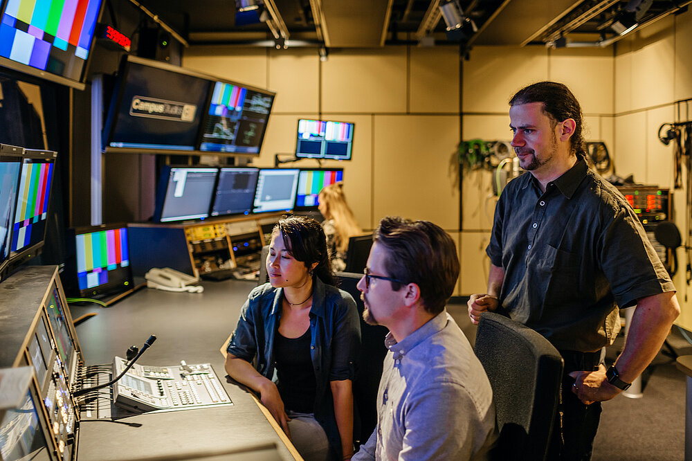An sieben Arbeitsplätzen in separaten Räumen haben die Studierenden in der Postproduktion die Möglichkeit, Videoproduktionen zu schneiden, zu vertonen und Farbkorrekturen daran vorzunehmen. Darüber hinaus können sie Arbeiten im Bereich 3D-Animation, Motion Graphics und Compositing umsetzen. Einer der Räume ist als Seminarraum ausgelegt, der ca. 15 Personen fasst. Zu den Schnittplätzen gehören auch ein separater Audioschnittraum mit Sprecherkabine und DAW-Controller sowie ein zentraler Geräteraum mit Ein- und Ausspielmöglichkeiten für verschiedene Videoformate.