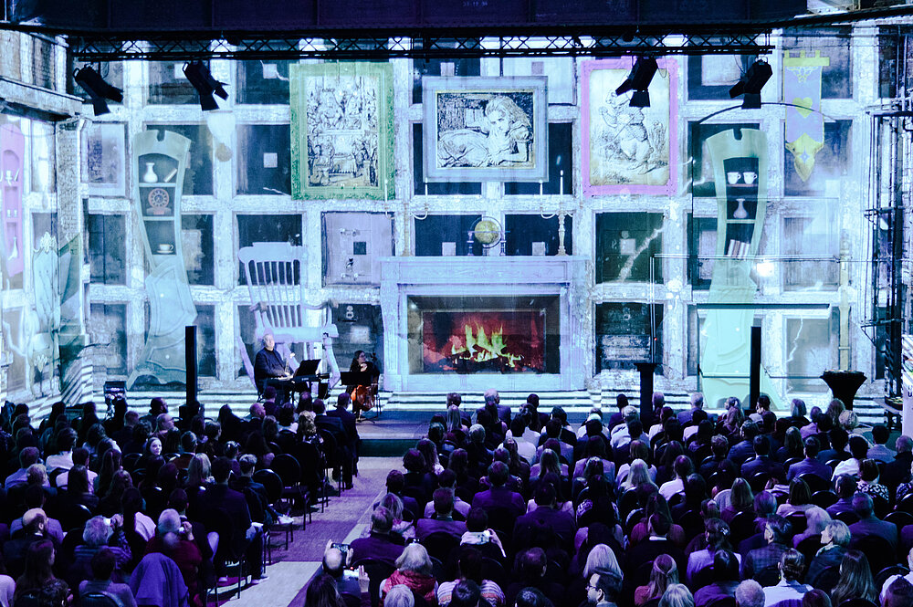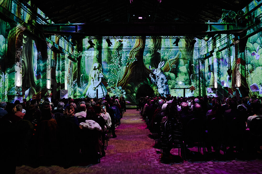 Während der Graduierung und beim anschließenden Sektempfang konnten die Gäste eindrucksvolle Lichtprojektionen bewundern, die Teil der im Kunstkraftwerk zu besichtigenden Ausstellungen HUNDERTWASSER experience und Die Wunderwelten von Alice waren.