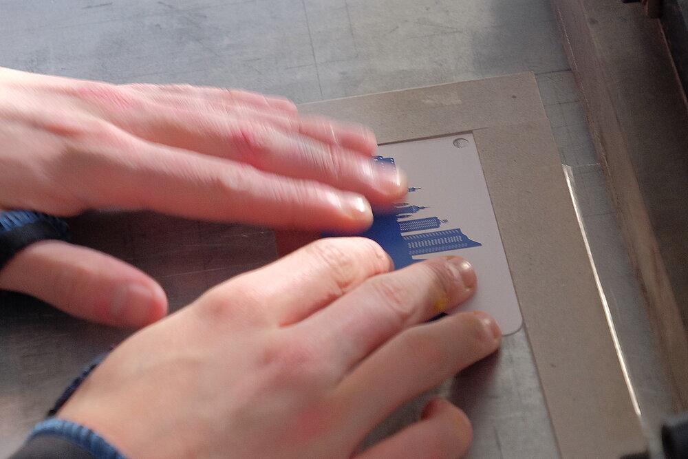 Im Drucksaal wurde verdeutlicht, wie sich ein farbiges Bild zusammensetzt, was Rasterpunkte sind und mit welchem Druckverfahren sich strukturierte Materialoberflächen optimal bedrucken lassen.