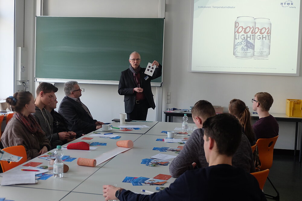 Prof. Holger Zellmer, Studiendekan, stellte in seiner Schnuppervorlesung den Industriedruck in den Mittelpunkt und Funktionalitäten jenseits von Text- und Bilddarstellungen vor. Farbe ist nicht mehr die wichtigste Eigenschaft, wie das über 500 Jahre lang der Fall war. Farbstoffe werden heute durch Substanzen ersetzt, die bestimmte Funktionen innehaben und beispielsweise als elektrische Leiter, Halbleiter oder Isolatoren fungieren oder als Indikatoren bestimmte Umgebungsveränderungen anzeigen.